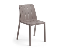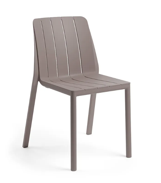 Okolju prijazen letvičast stol Tiberina brez naslonjal za roke; odlikujejo ga zaobljene linije in noge okroglega preseka; kompaktna in trajnostna rešitev za sodoben dom.